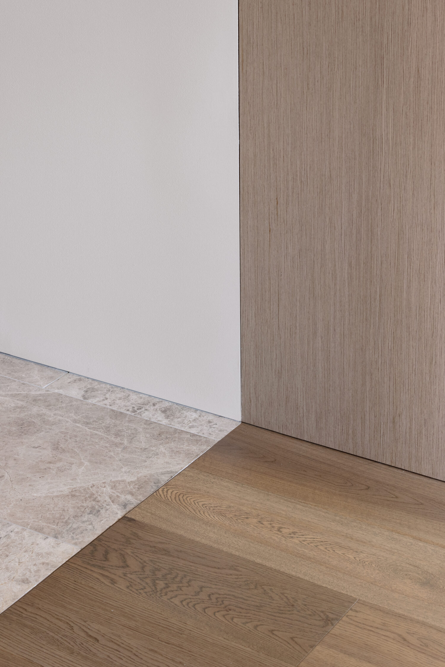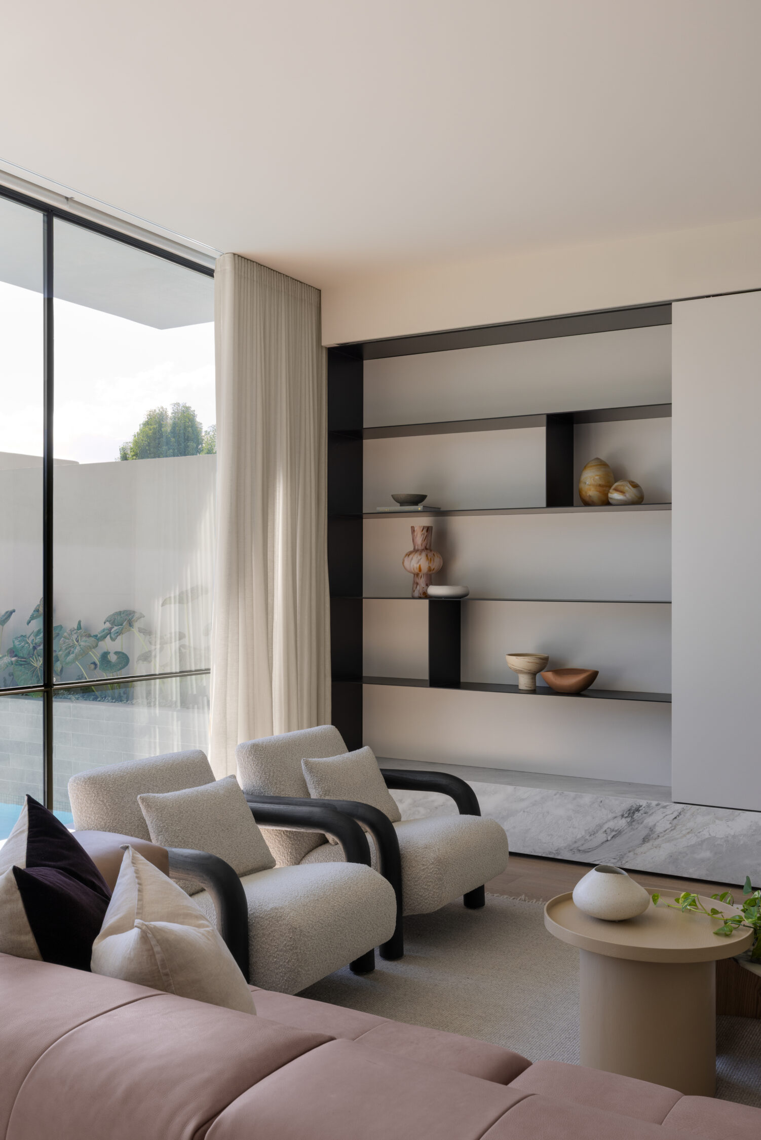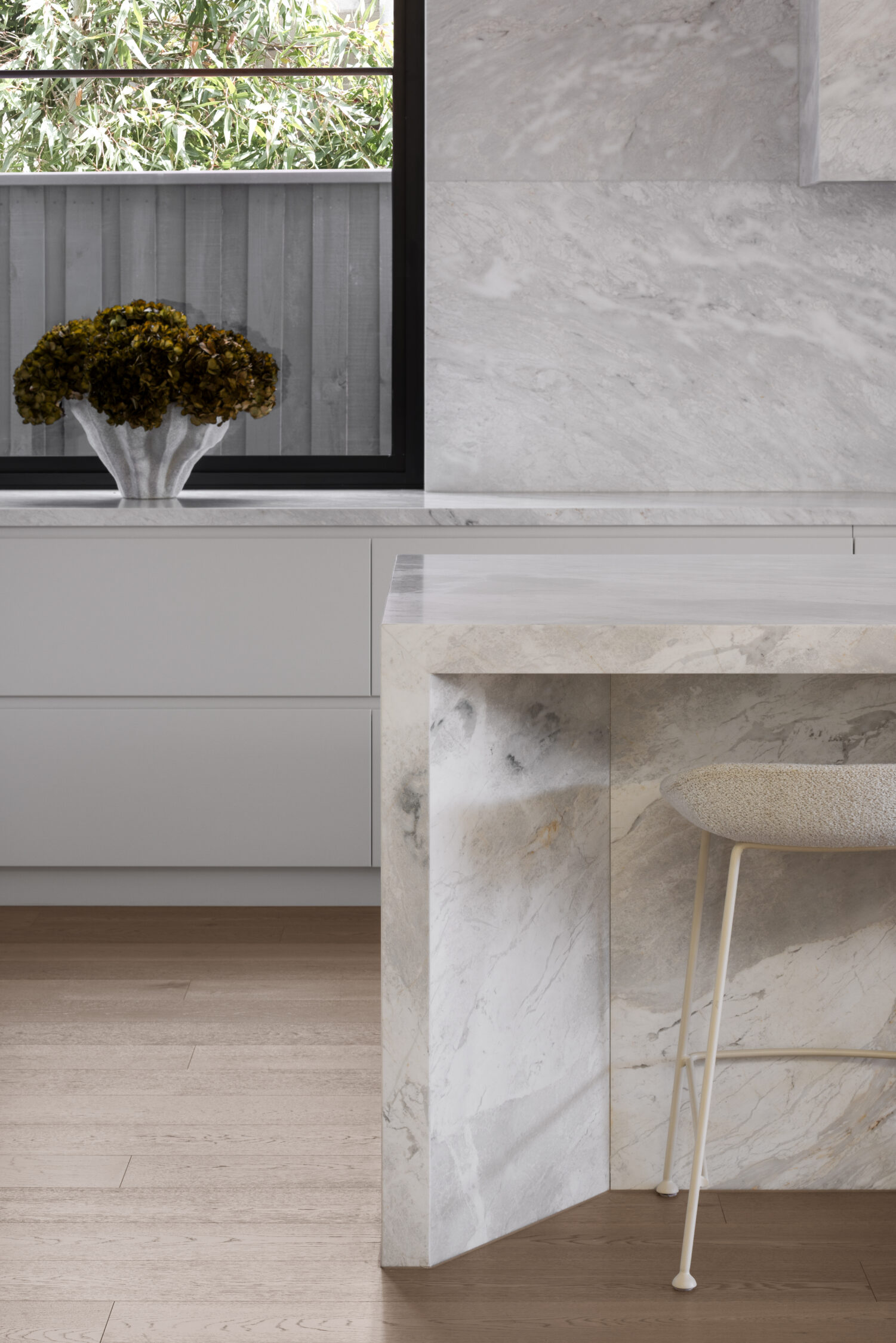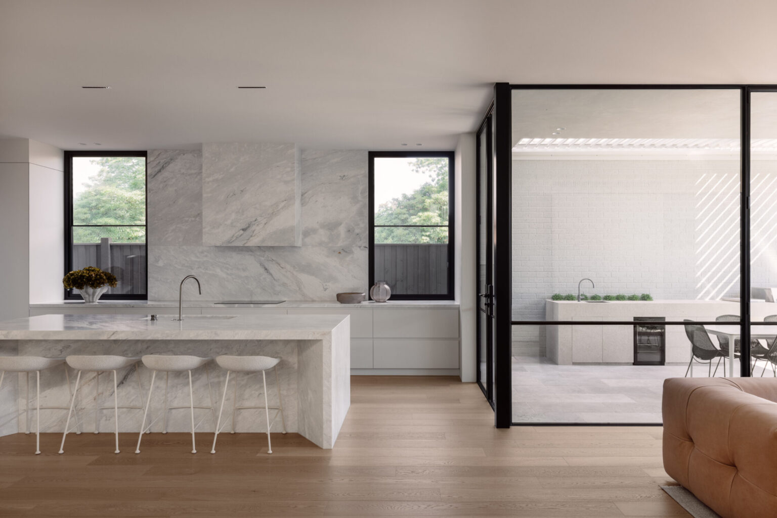 That same restraint carries through into the material palette. There’s no reliance on bold contrasts or feature-driven finishes. Instead, the home leans into warm whites, natural stone and soft timber tones, allowing texture to do the heavy lifting. Italian Lorde White marble brings movement and variation, Woodcut timber flooring adds warmth underfoot, and custom full-height steel doors balance privacy with light. It’s a palette that feels timeless because it isn’t chasing anything—it simply works.