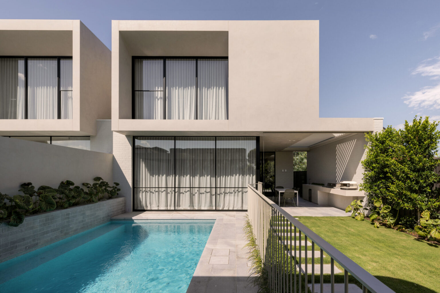 The alfresco kitchen is custom designed and clad in sintered stone, complete with BBQ, side burner, sink and pizza oven—highly functional while remaining visually aligned. A custom metal pool fence maintains clear visibility without the maintenance typically associated with alternative systems.