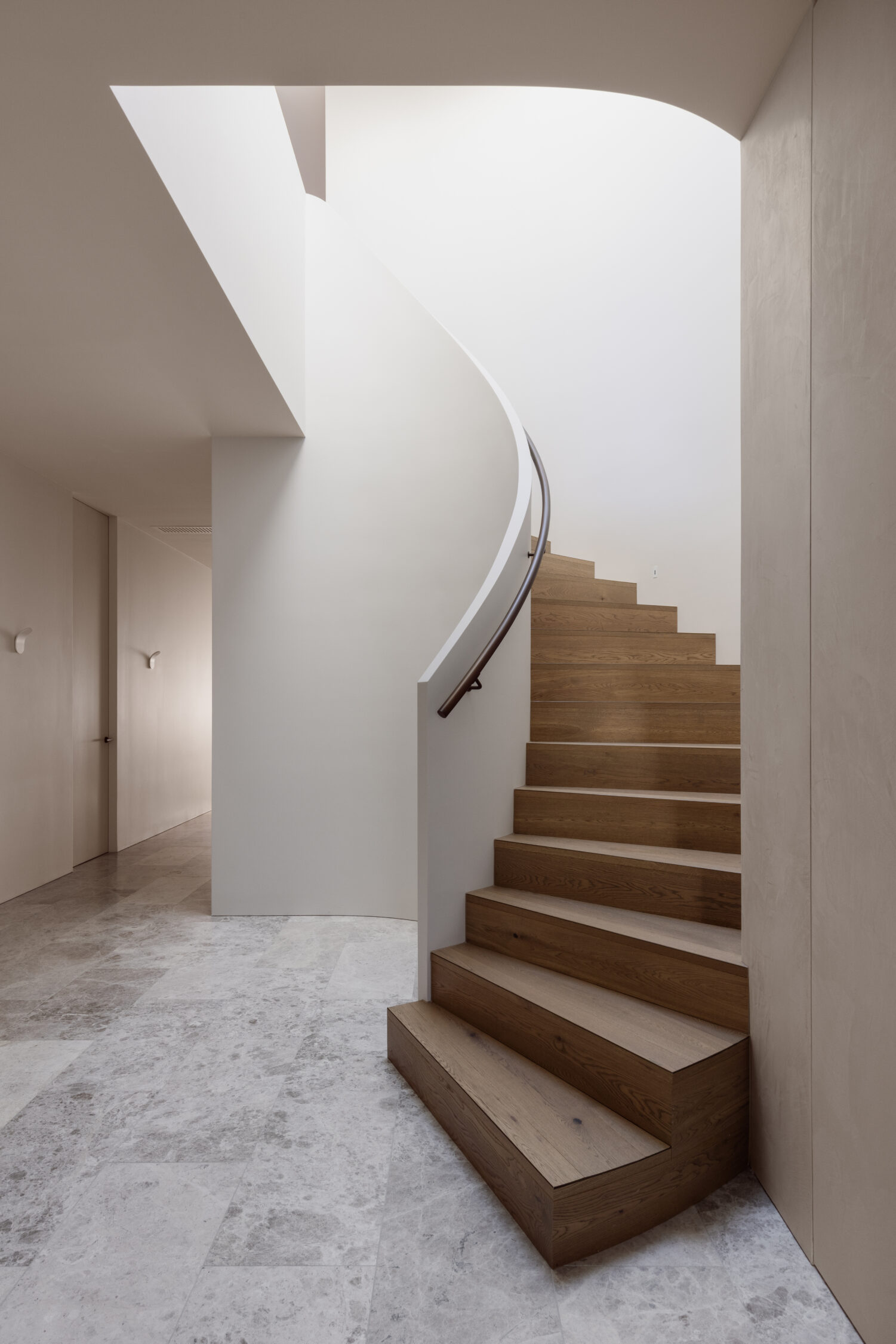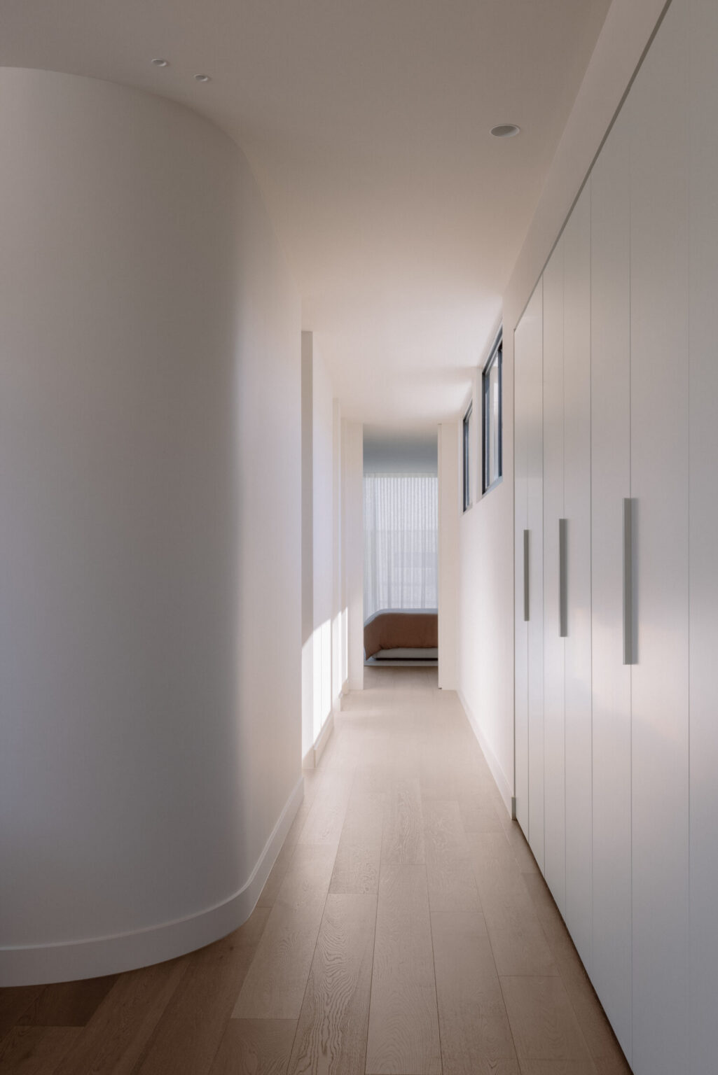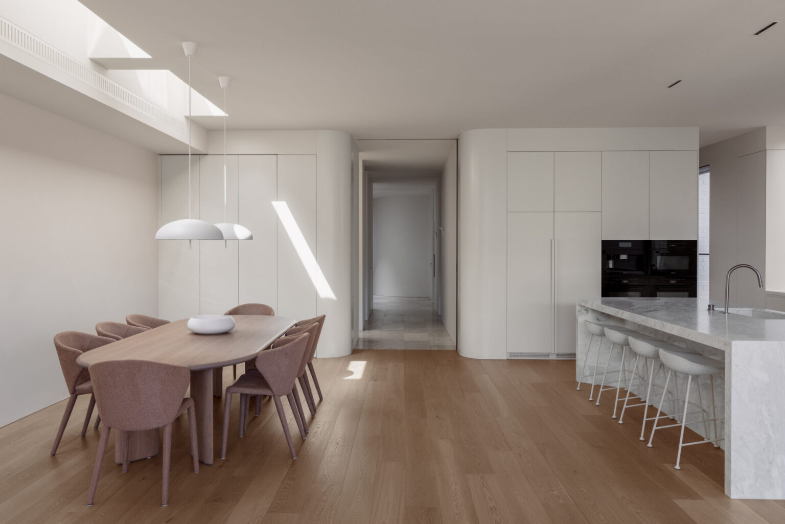 Subtle curves are introduced throughout to soften transitions and guide movement. They’re not overplayed, but they make a difference—removing the harshness of purely linear design and improving how the home feels to live in.
