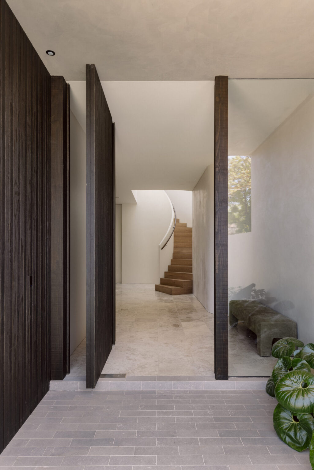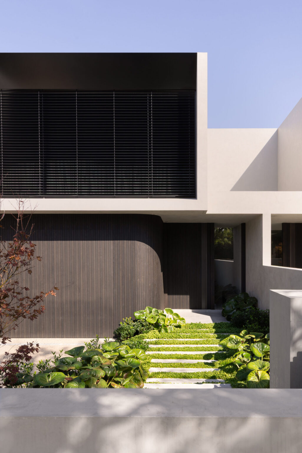 This same discipline carries through to the exterior. Strong forms define the façade, softened by curves and grounded by a restrained palette, including English Walnut stained Accoya timber battens.