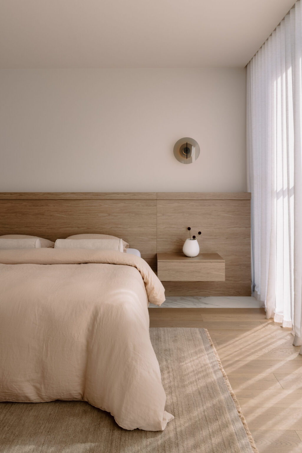 The bedroom itself leans into a more luxurious, hotel-like feel. A custom headboard anchors the space, complemented by Neolith Calacatta Royale stone detailing. It’s calm, refined, and intentionally minimal, allowing the materials to do the work.