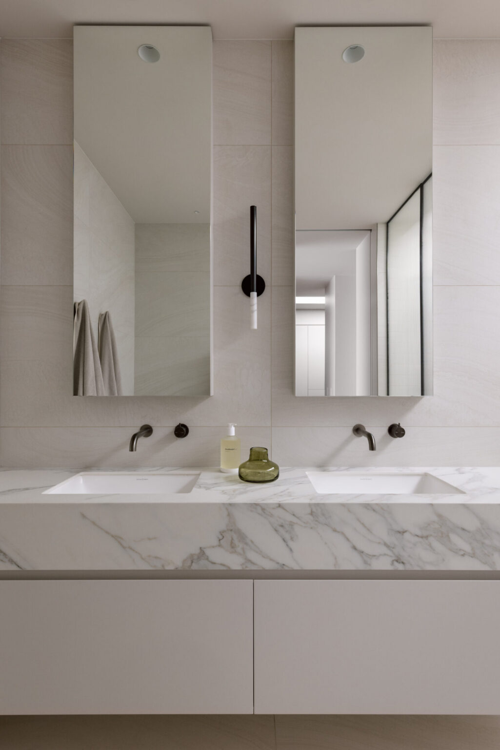In the kitchen Taj Mahal honed quartzite anchors the space, bringing warmth and movement through its natural veining. Paired with Eveneer timber veneer joinery, the palette feels softer and more layered. It’s a subtle but clear departure—same layout, entirely different atmosphere.