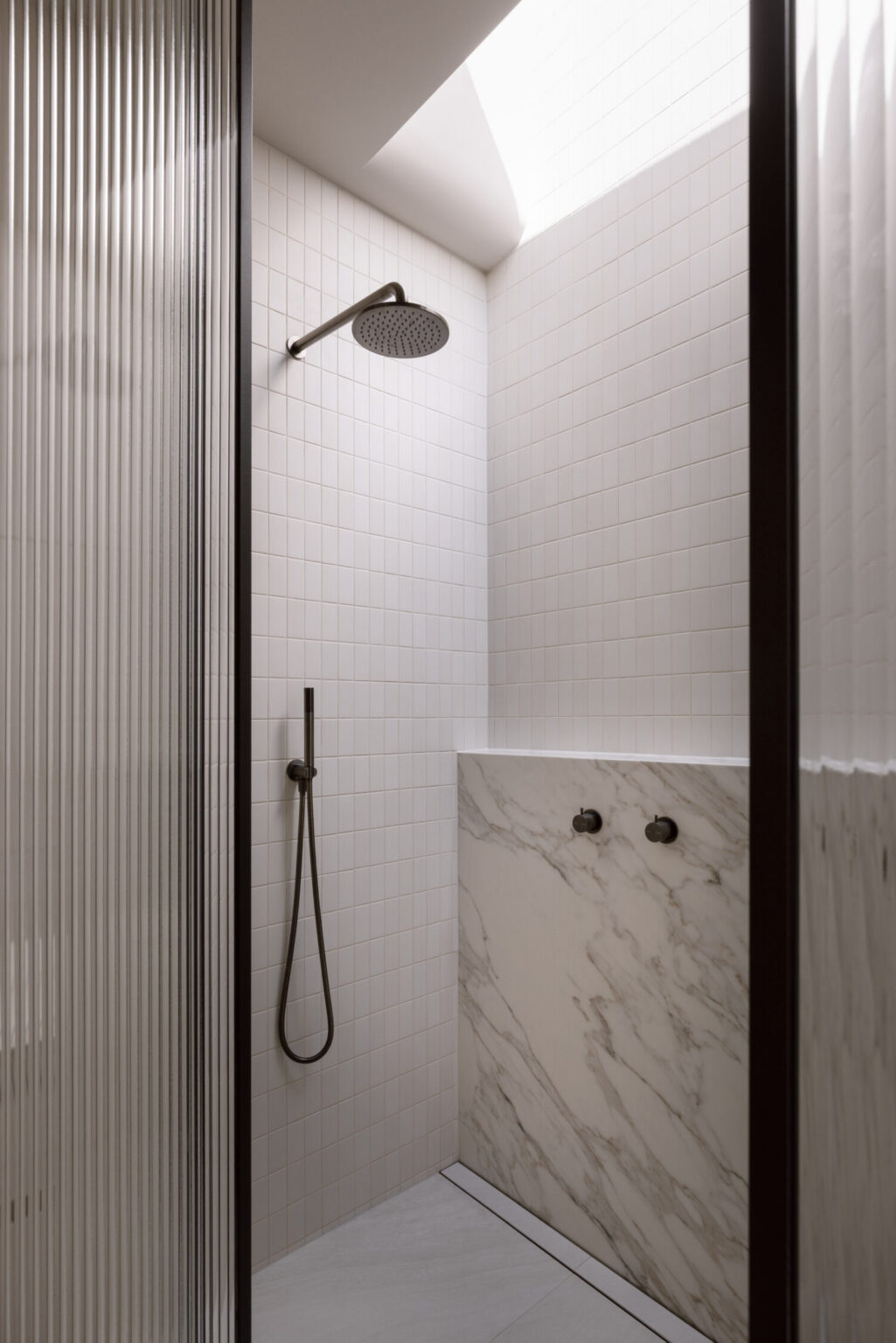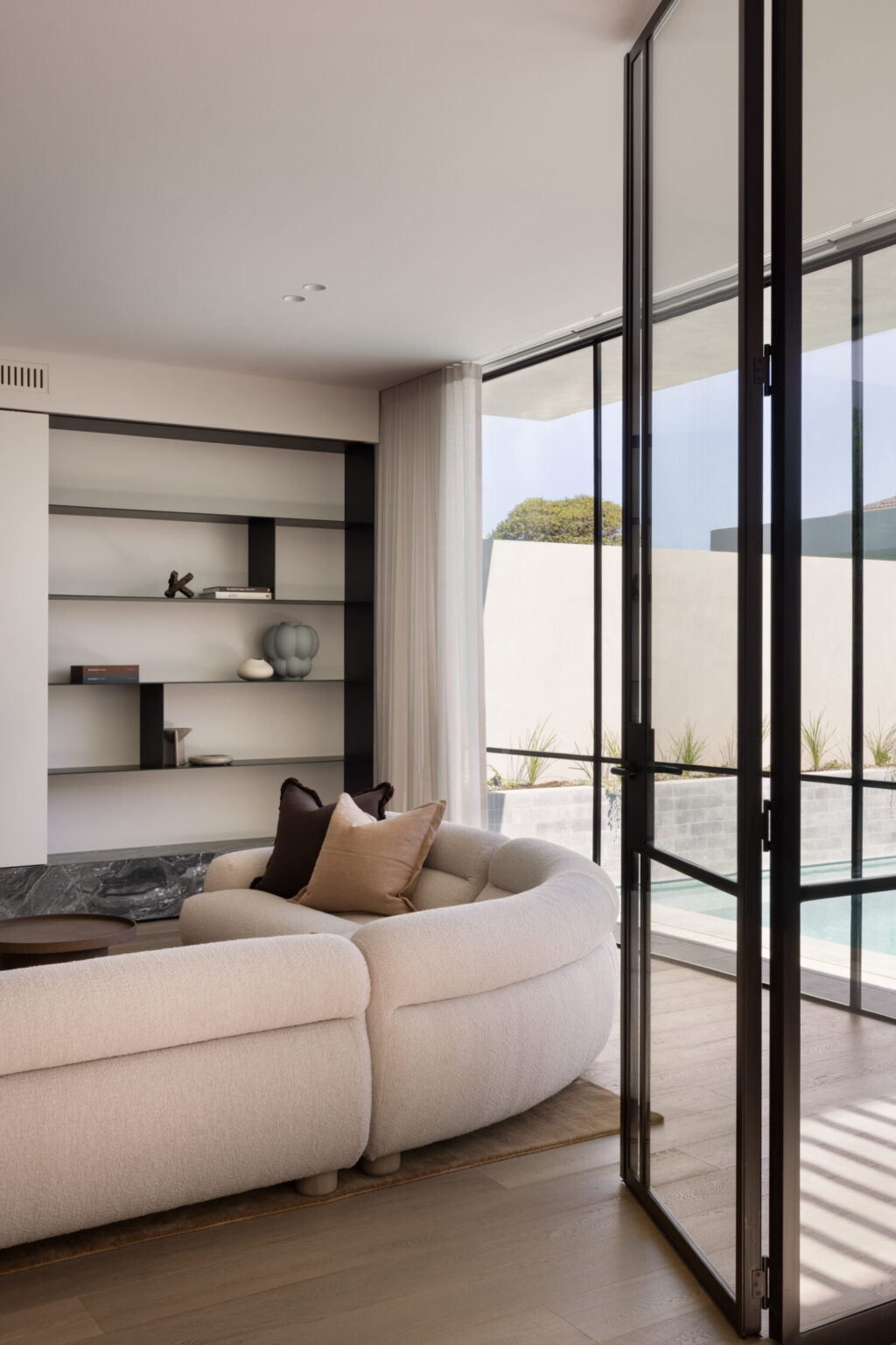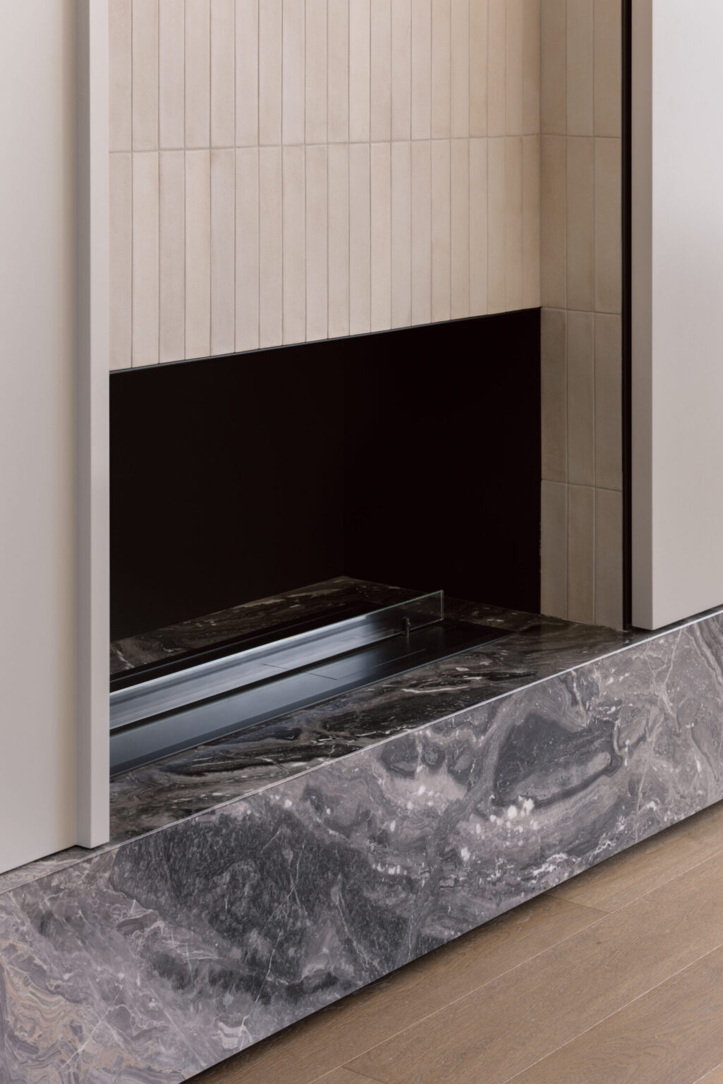 In the living area, the fireplace becomes a central feature. An Arabascato Orobico marble plinth grounds the design, paired with custom joinery and metal shelving. A sliding partition allows the TV to be concealed when not in use, maintaining the integrity of the space without compromising practicality.