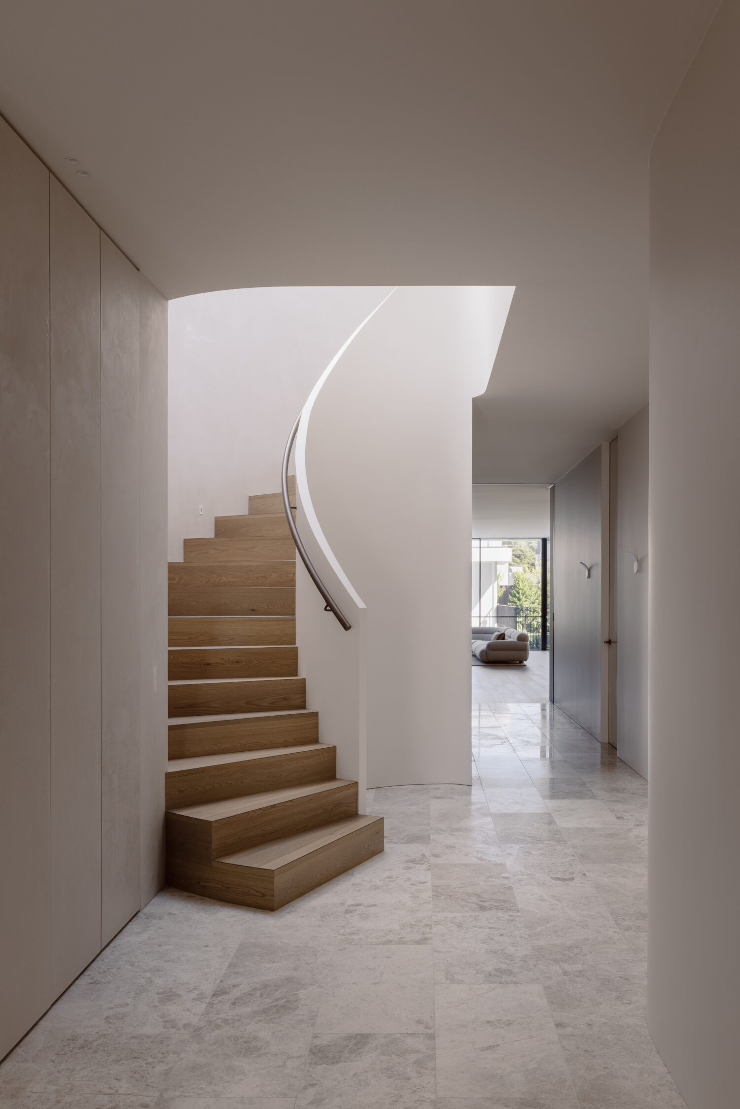 The entry sequence is where the home really establishes its identity. Venetian plaster wraps the walls and continues seamlessly over custom joinery, sweeping up the curved staircase. It leads the eye directly to the circular skylight above, creating a strong but controlled sense of arrival.