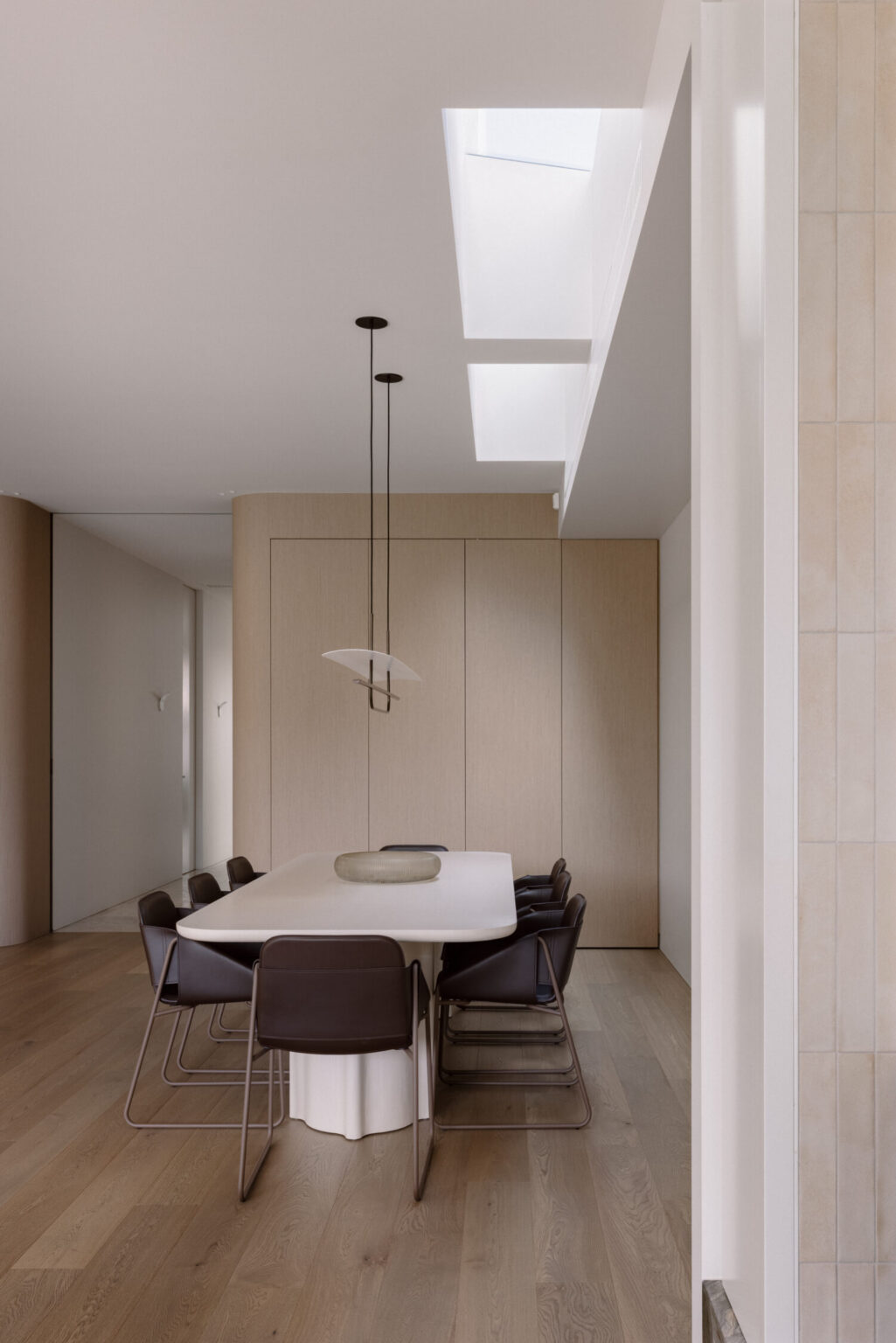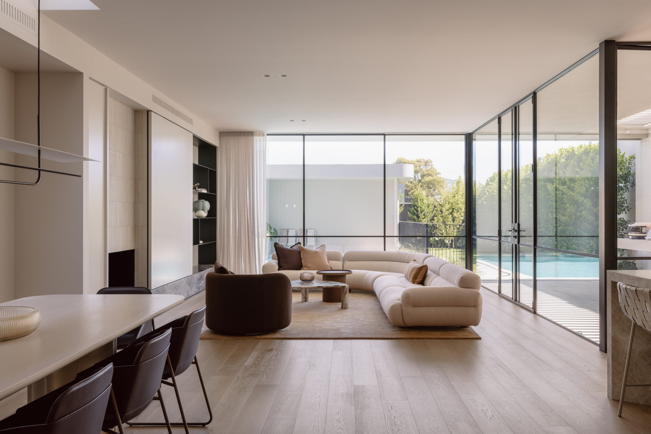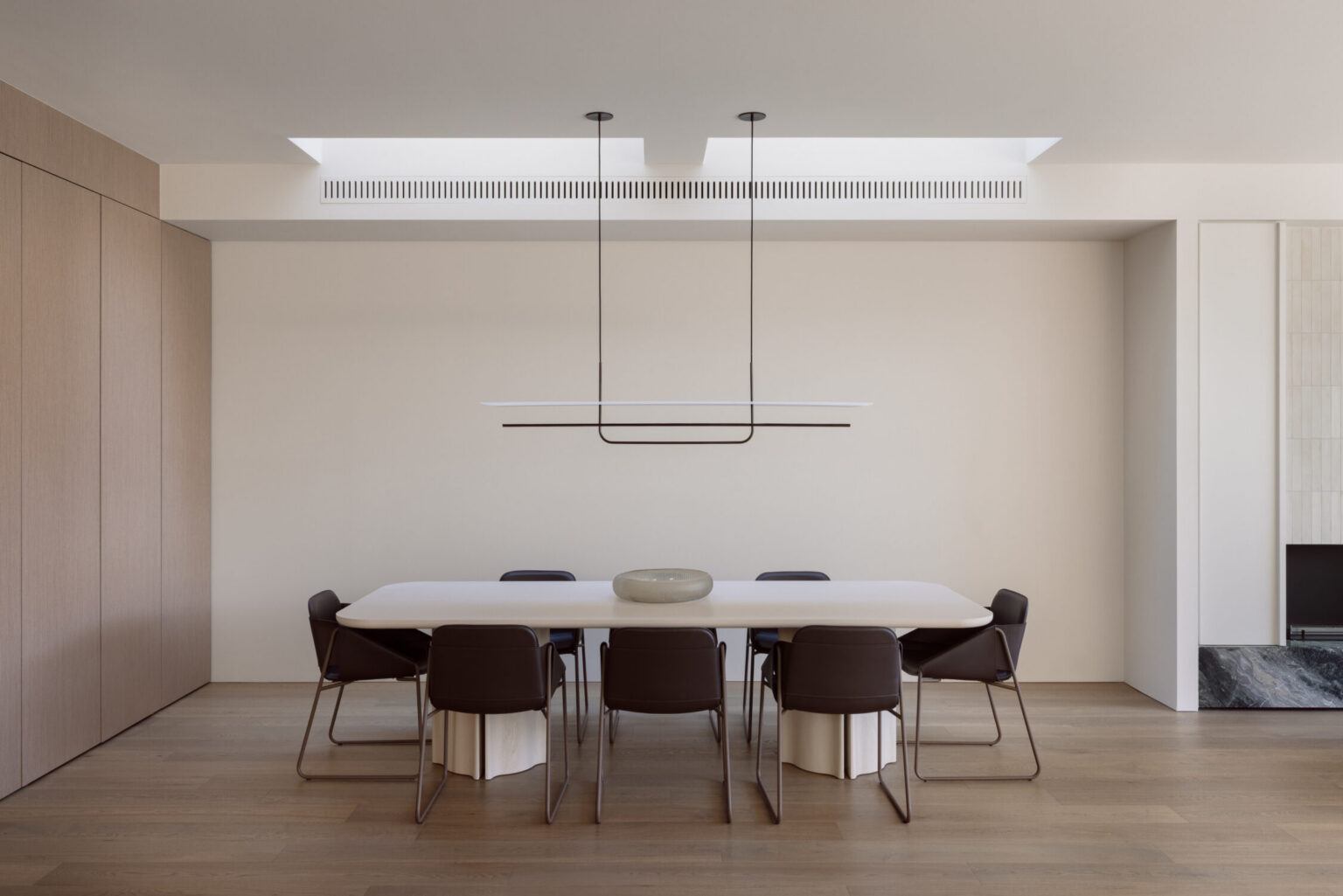 The dining area introduces one of the more considered moments in the home—a fully concealed bar integrated into custom joinery. It’s not immediately obvious, but that’s the point. It reveals itself when needed, adding a layer of functionality without interrupting the clean lines of the space.