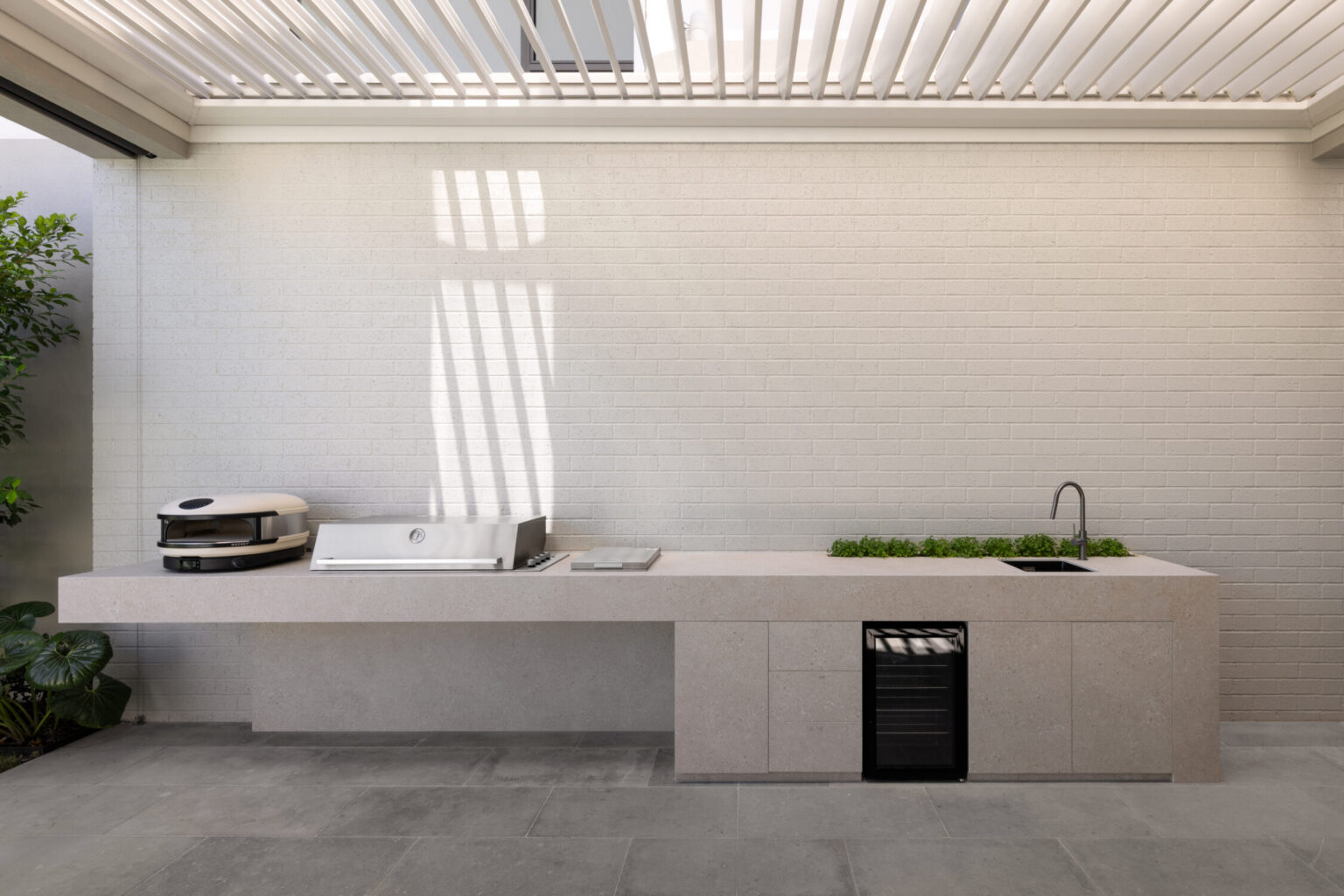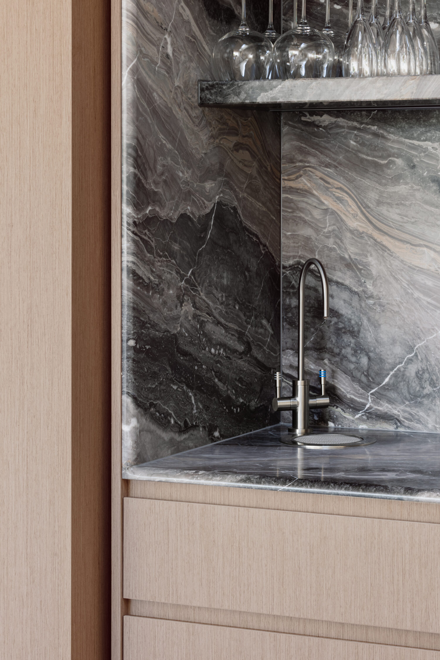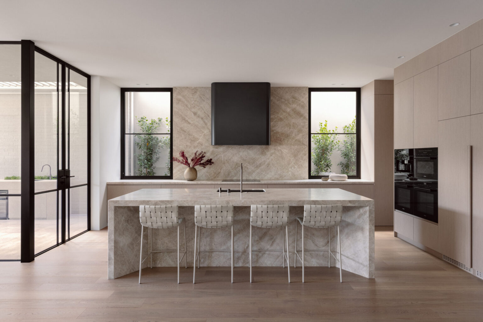 The dining area introduces one of the more considered moments in the home—a fully concealed bar integrated into custom joinery. It’s not immediately obvious, but that’s the point. It reveals itself when needed, adding a layer of functionality without interrupting the clean lines of the space.